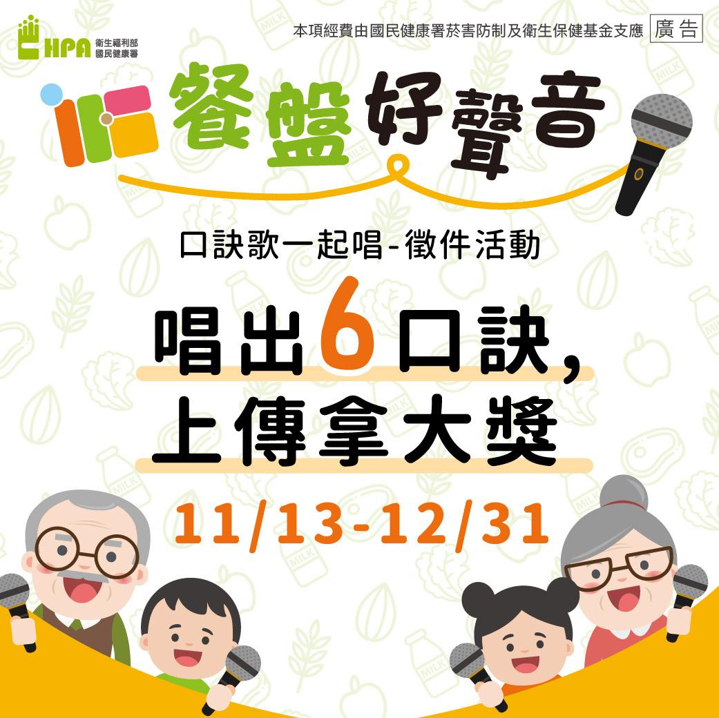 國健署現正辦理「餐盤好聲音」口訣歌一起唱活動,只需要上傳口訣歌跟著唱影片或是改編音樂,即能參加抽獎及爭取人氣獎,活動日期至12/31日止,歡迎踴躍參與!