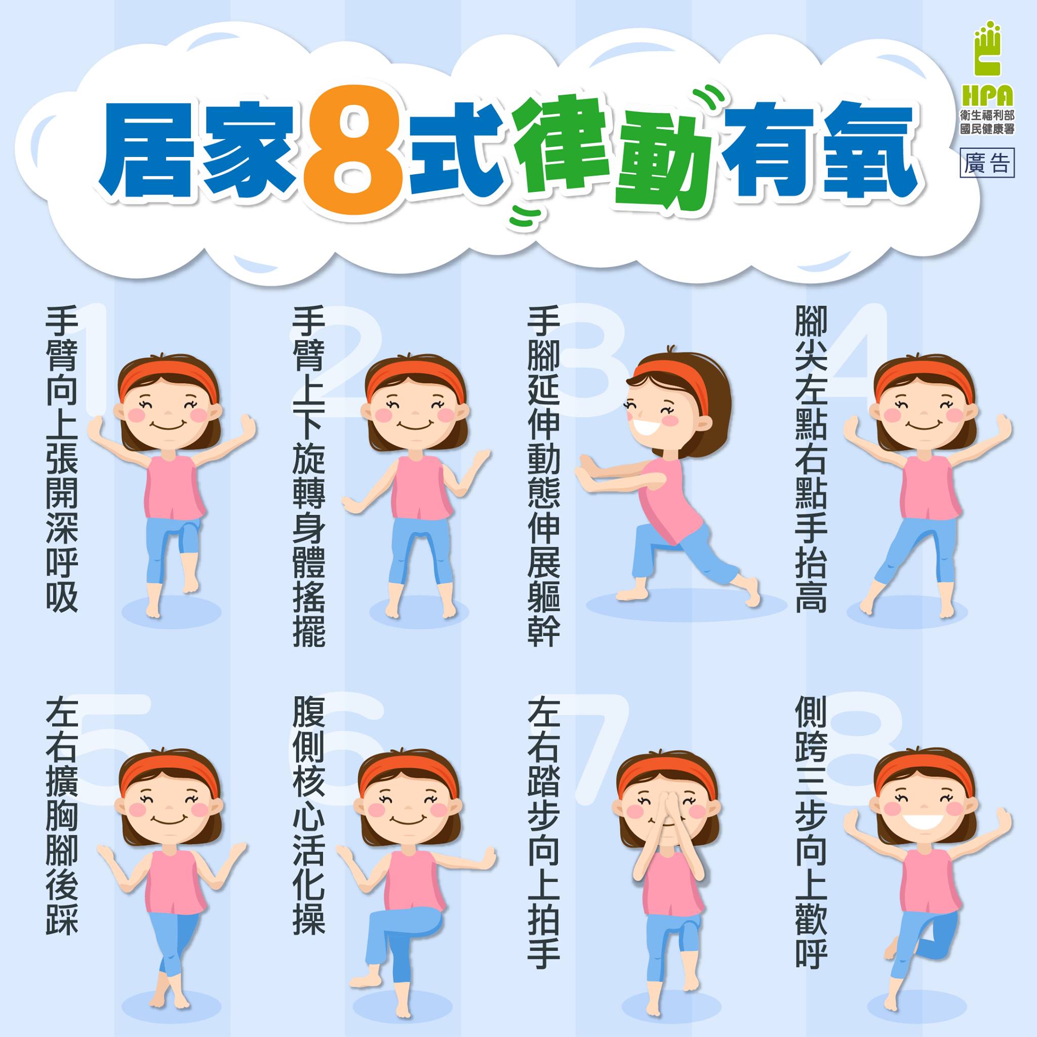 為了大家的身體健康,國民健康署提供「居家8式律動有氧」秘笈資訊