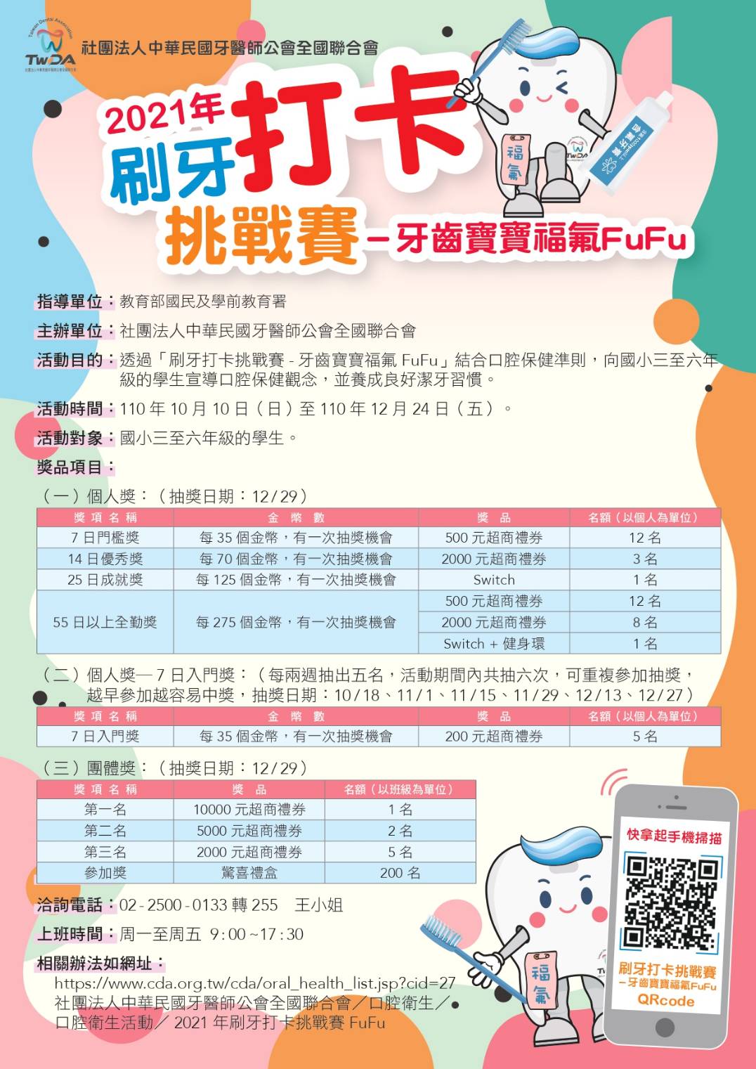 凡參加「刷牙打卡挑戰賽-牙齒寶寶福氟FuFu」之學生將有機會獲得Switch、超商禮券、驚喜禮盒等優質好禮,將於中華民國牙醫師公會以公開方式進行抽獎,並於官網上公告得獎名單。