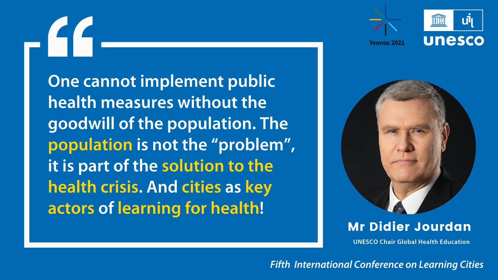 💡Didier Jourdan教授回顧了終身學習(Lifelong learning)在建立健康、公平、包容、永續和彈性的城市方面有著核心作用,健康危機使人們大開眼界,對終身學習的健康與福祉帶來挑戰,但這也提醒大家,若沒有它們或反抗它們,將無法使人們健康。