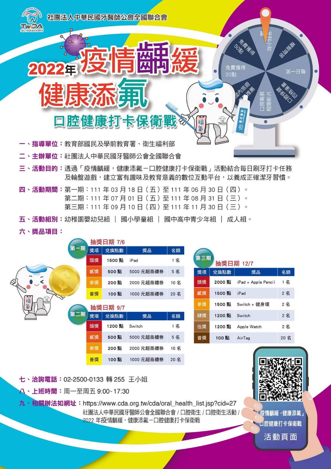 🔔獎勵措施:凡參加本次活動將有機會獲得優質好禮,本次獎項有iPad、Apple Watch、Switch、AirTag、超商禮券等,獎項將於本會以公開方式進行抽獎,並將中獎名單公告於本會網站[社團法人中華民國牙醫師公會全國聯合會/口腔衛生/口腔衛生活動]